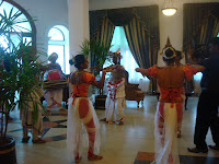 The Junior Kandian dance class struggles a bit with left and right hands . Maybe one day they will be dancing like these performers welcoming a government guest to Queens hotel in Kandy.