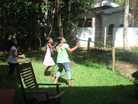 The older Kandian dance class play volleyball over the garden fence until the senior class begins. Meanwhile the 2 Computer classes are going on indoors and Mangelica and I are babysttting for the mothers in the class and keeping an eye on the older kids playing ,and making rather lot of orange juice and tea and keeping Zigger away from the ginger biscuits.