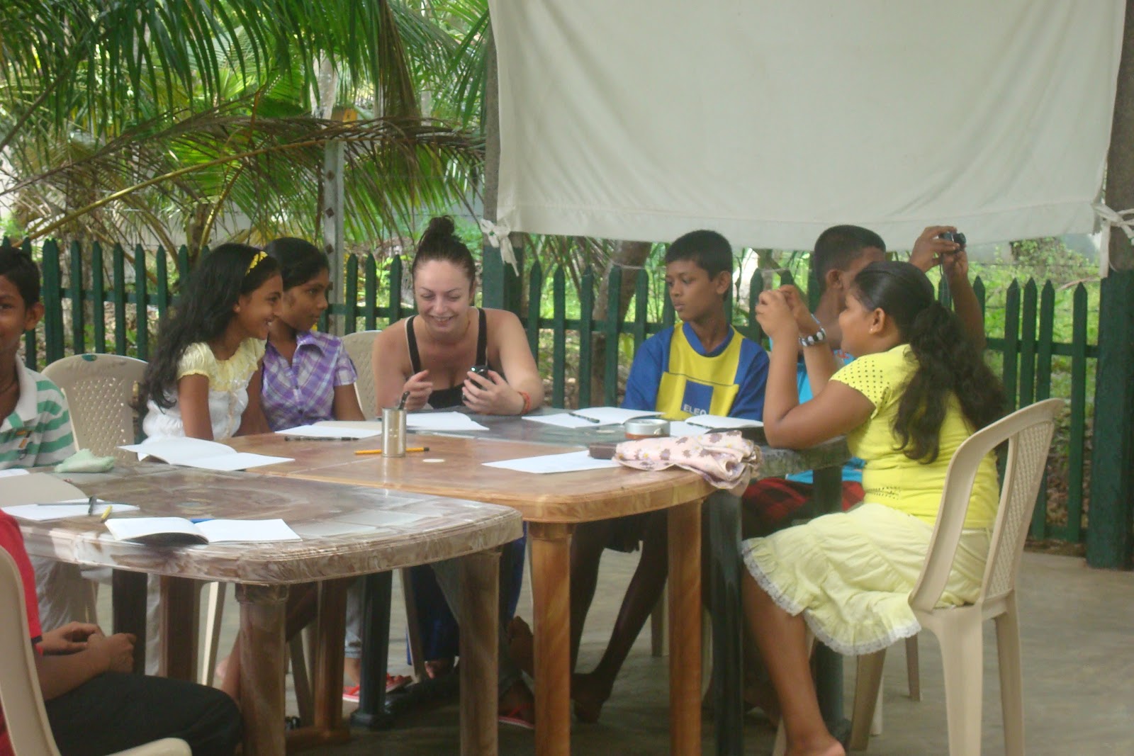 Mangelica and her son and daughter painted the fence we had put round the dancing / theatre outside space to keep the dogs out and the little children in. A Brighton glass making workshop paid for this fence which saves us lots of energy - washing the floor every time we used it was not good and however admirable dogs trying to learn kandy dance may be it is not quite what we're here for!