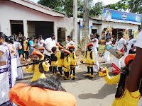 The Dancers set off at midday and got back at 8.30pm. the children were much less exhausted than the parents! I spent the afternoon ferrying bottles of water, elastoplasts and boiled sweets between different points of the walk .. safe and relatively cool in a tuk yuk. There were 11 elephants in the parade and the one following our dancers disgraced himself by uprooting a whole banana tree from a garden and weilding it around. He had to be rested while the tree was removed from his trunk!